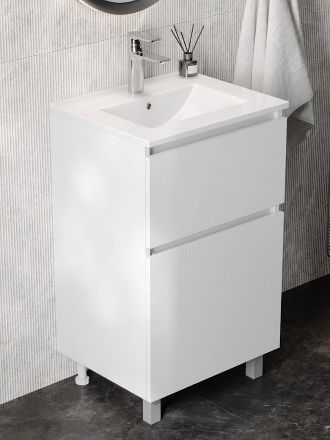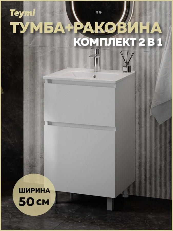 Тумба напольная с раковиной для ванной 50 см Laina белая, умывальник Ritta 50 F16042 от бренда Teymi — это стильное и функциональное решение для санузлов, где важна практичность, аккуратный внешний вид и долговечность мебели. Конструктивная особенность тумбы ― напольная установка, что гарантирует устойчивость и удобство эксплуатации, а универсальное исполнение позволяет гармонично вписать мебель практически в любой интерьер.