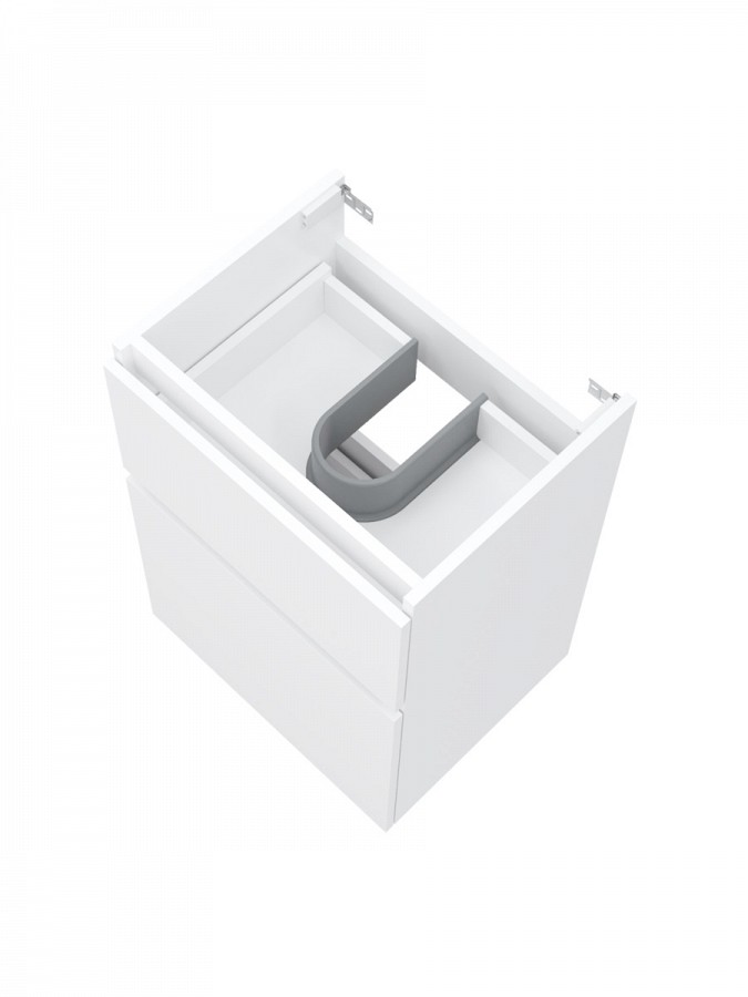 Интерьерная часть конструкции включает два выдвижных ящика с направляющими скрытого монтажа. Благодаря встроенным доводчикам ящики закрываются мягко и бесшумно. Внутри удобно размещать средства гигиены, аксессуары и бытовые принадлежности, освобождая поверхность и поддерживая порядок.