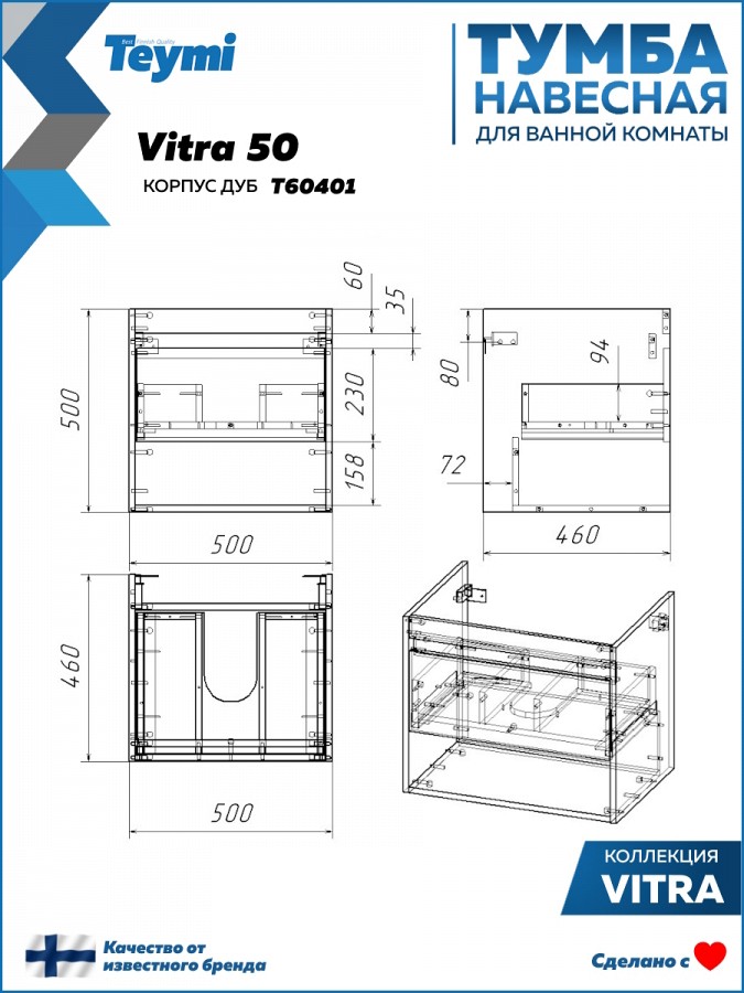 Тумба Teymi Vitra 50 T60401 — это универсальное решение для обустройства ванной комнаты, которое объединяет продуманный функционал, минималистичный стиль и свободу индивидуального выбора отделки.