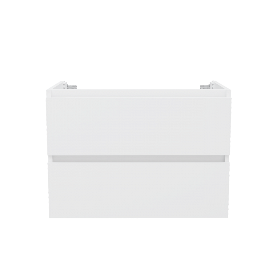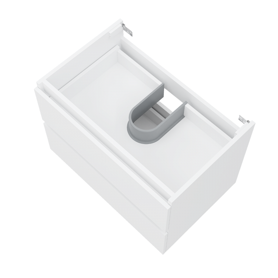 Функциональность тумбы обеспечивается двумя выдвижными ящиками на направляющих скрытого монтажа. Встроенные доводчики делают процесс закрывания плавным и тихим, что особенно важно в ежедневном использовании. Вместительные отсеки позволяют хранить средства гигиены, текстиль и необходимые аксессуары, поддерживая порядок и освобождая поверхность.