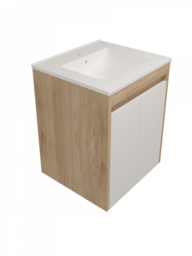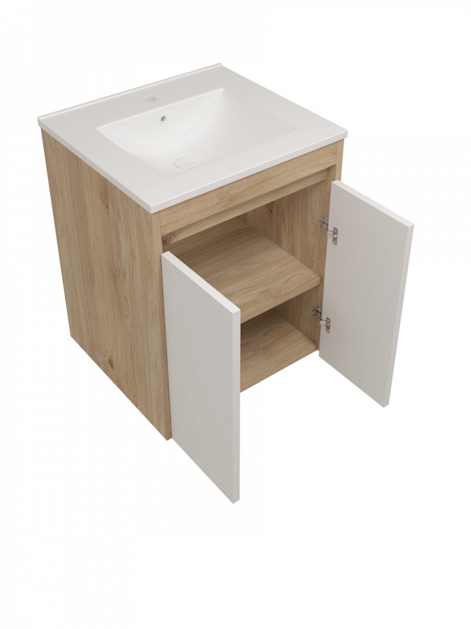 Корпус выполнен из ЛДСП с декором под светлый дуб, придающим мебели тёплый натуральный вид. Фасад из МДФ в матовом белом цвете с ПВХ-плёнкой подчёркивает современный стиль и при этом устойчив к влаге и износу. Универсальная ориентация обеспечивает гибкость установки.
