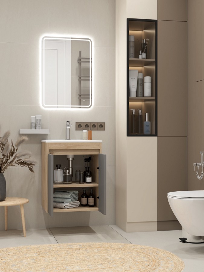 Модель оснащена удобной полкой с дверцей на надёжных петлях Boyard с доводчиком, который обеспечивает мягкое закрывание без шума и ударов. Внутреннее пространство продумано для хранения бытовой химии, косметики и аксессуаров, помогая поддерживать порядок даже в компактной ванной.
