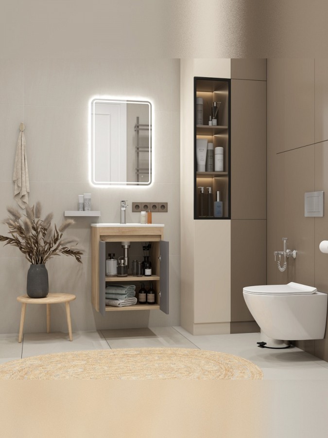 Тумба оборудована полкой с дверцами на качественных петлях Boyard с доводчиком, который обеспечивает плавное и бесшумное закрывание. Внутреннее отделение предназначено для удобного хранения бытовой химии, полотенец и аксессуаров, помогая поддерживать порядок даже в небольшой ванной.