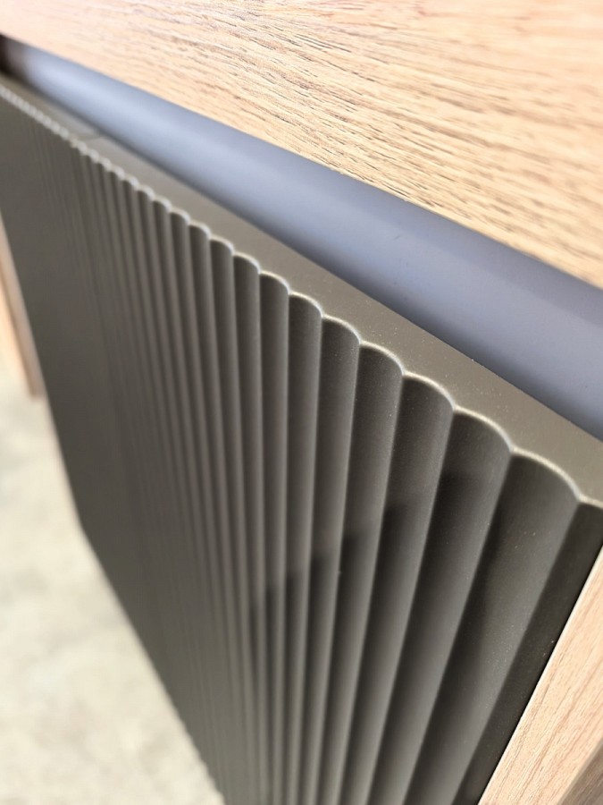 Эта модель оптимально подходит для компактных помещений. Корпус из прочного ЛДСП цвета светлый дуб придаёт теплоту и натуральный акцент интерьеру. Волнистый рельефный фасад выполнен из МДФ в трендовом матовом графитовом оттенке, с надёжным ПВХ-покрытием, устойчивым к влаге и механическим повреждениям. Универсальная ориентация конструкции даёт возможность вписать её в разные планировки.