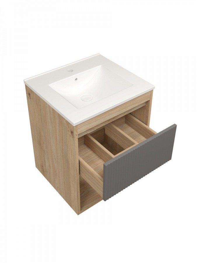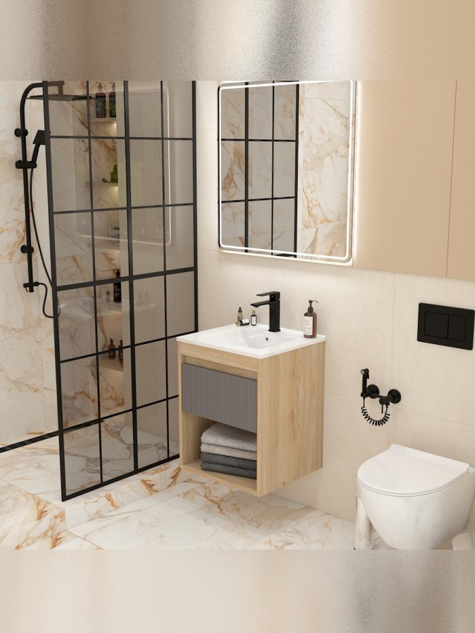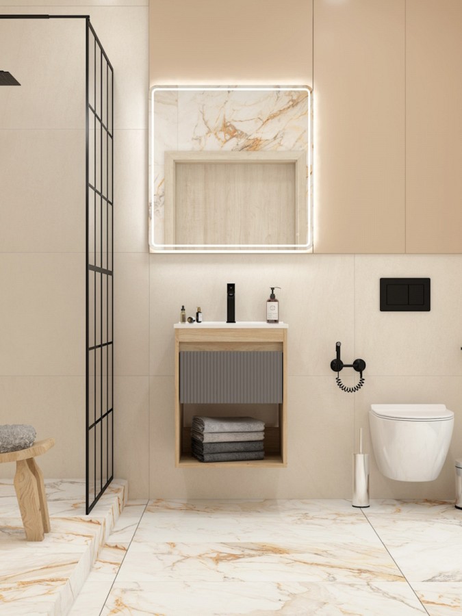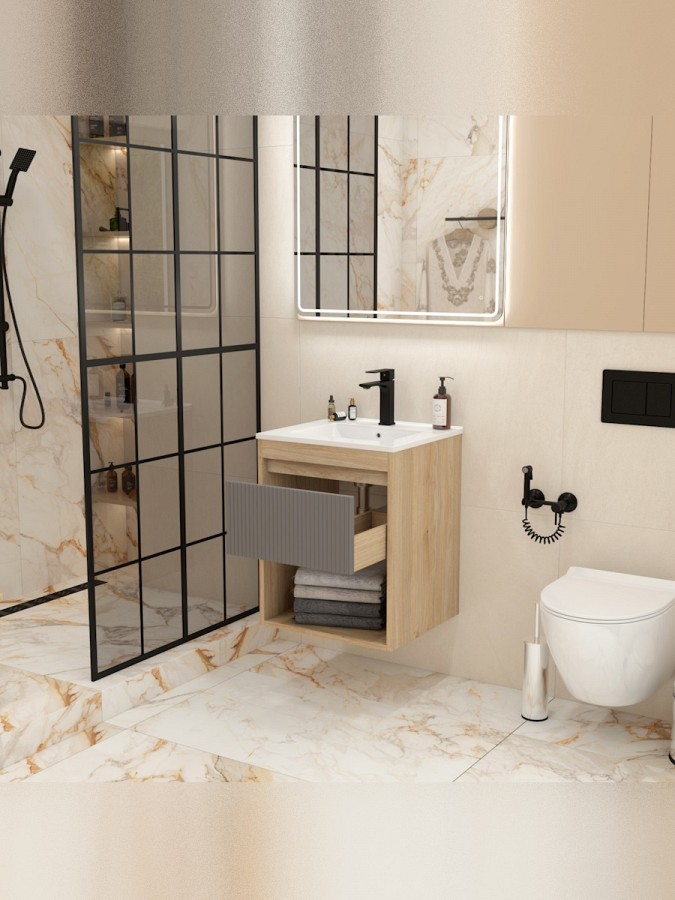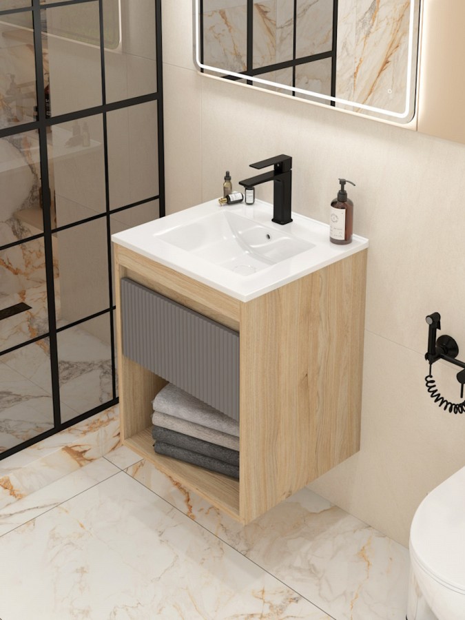 Ширина 50 см идеально подходит для небольших ванных комнат, сохраняя при этом все необходимые зоны хранения и удобства использования. Форма и размер раковины позволяют экономно расходовать место и встраиваться в большинство стандартных планировок.