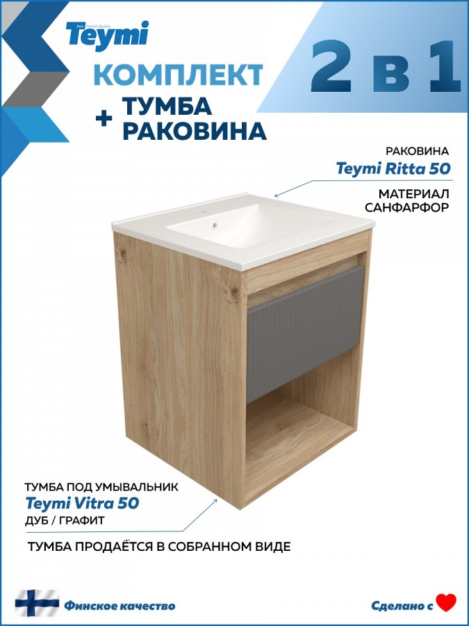 Продукция бренда Teymi известна вниманием к деталям и качеством сборки. Тумба поставляется полностью собранной, что упрощает установку. Гарантия 2 года на мебель и 10 лет на раковину подчёркивает надёжность и долговечность решения.
