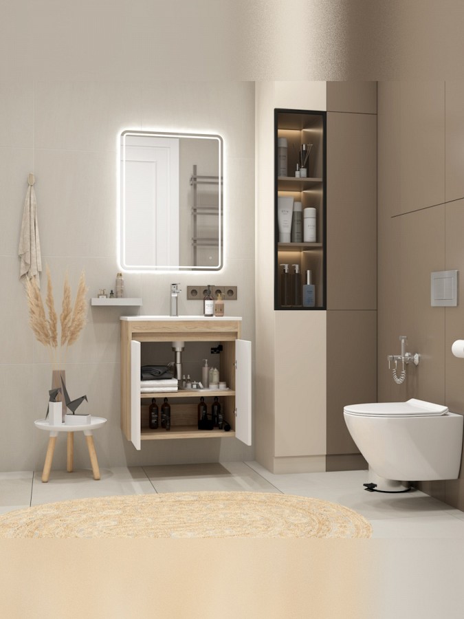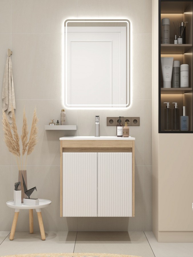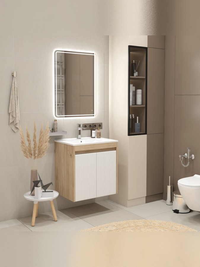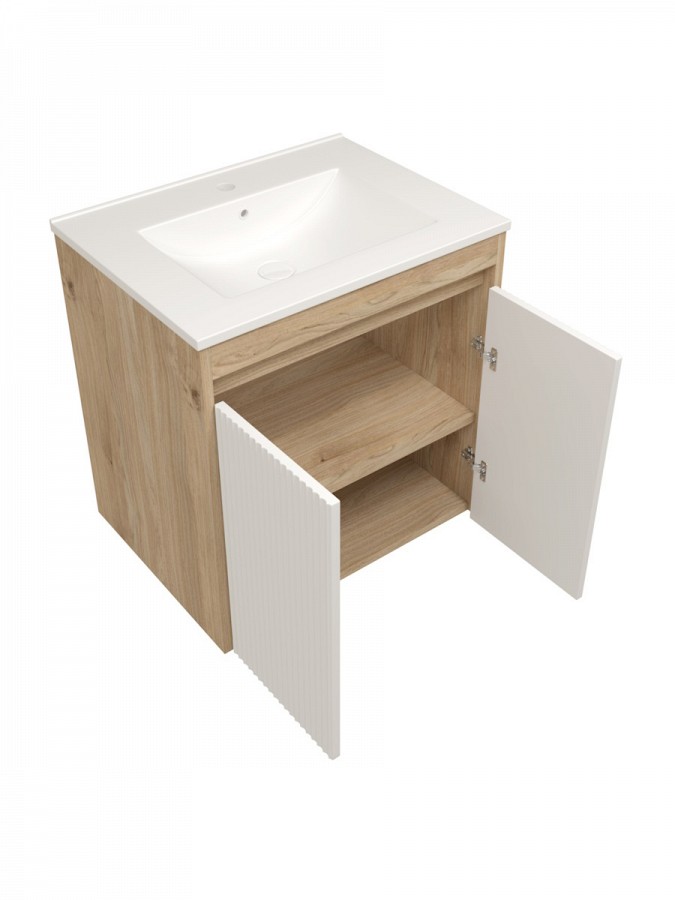 Тумба подвесная с раковиной для ванной 60 см Teymi Netta корпус дуб фасад белый раковина Ritta 60 F16019— стильное и практичное решение для современного интерьера, позволяющее эффективно организовать пространство и подчеркнуть актуальный дизайн.