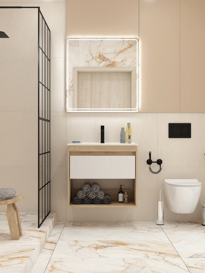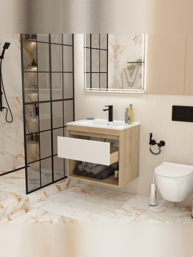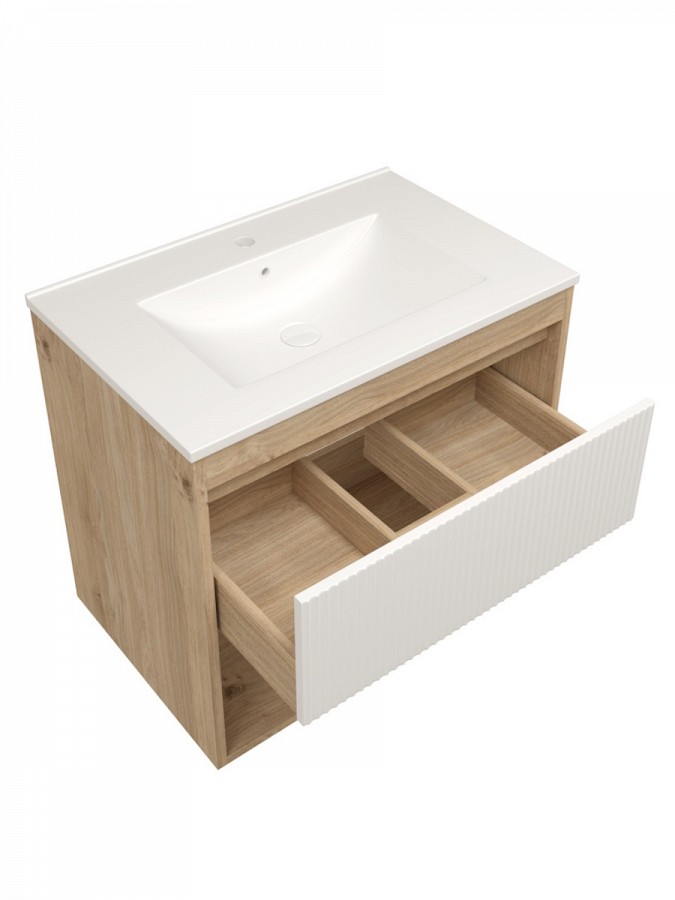 Корпус изделия выполнен из прочного ЛДСП с тёплым древесным рисунком, подчёркивающим натуральный характер дизайна. Белый матовый фасад с волнистым рельефом из МДФ с ПВХ-покрытием придаёт композиции чистый и лаконичный вид, отлично гармонируя с любой отделкой ванной комнаты.