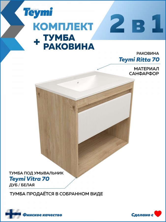 Мебель поставляется уже собранной, обеспечивая простоту установки и экономию времени. Финское качество бренда Teymi подтверждено гарантией 2 года на мебельные элементы и 10 лет на керамическую часть.