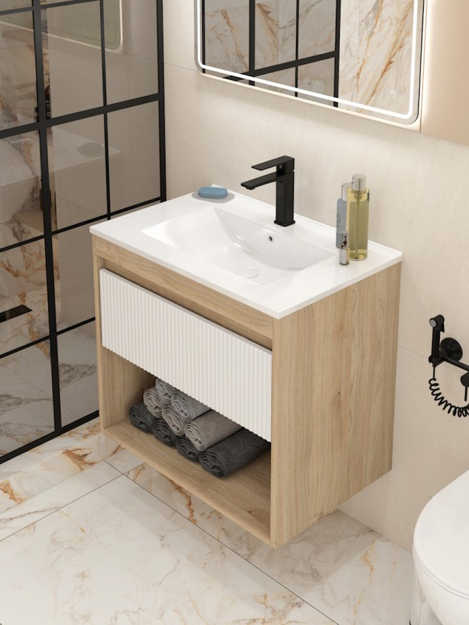 Тумба подвесная с раковиной для ванной 70 см Teymi Vitra корпус дуб фасад белый раковина Ritta 70 F16011 — функциональное и стильное решение для современного интерьера.