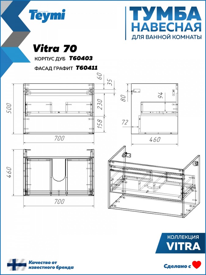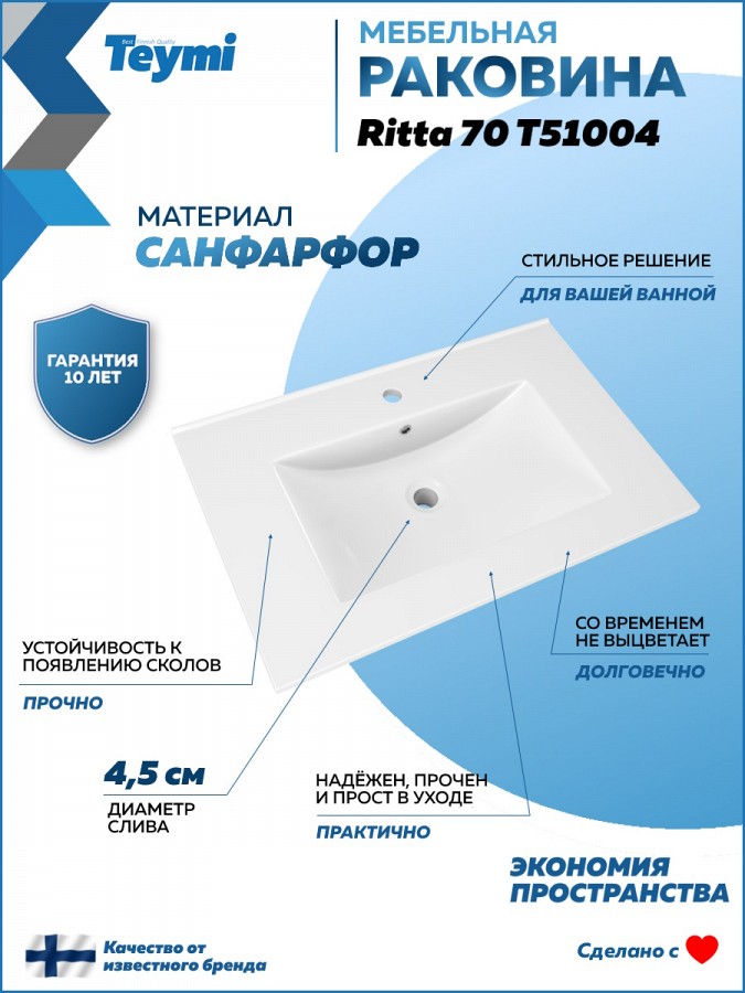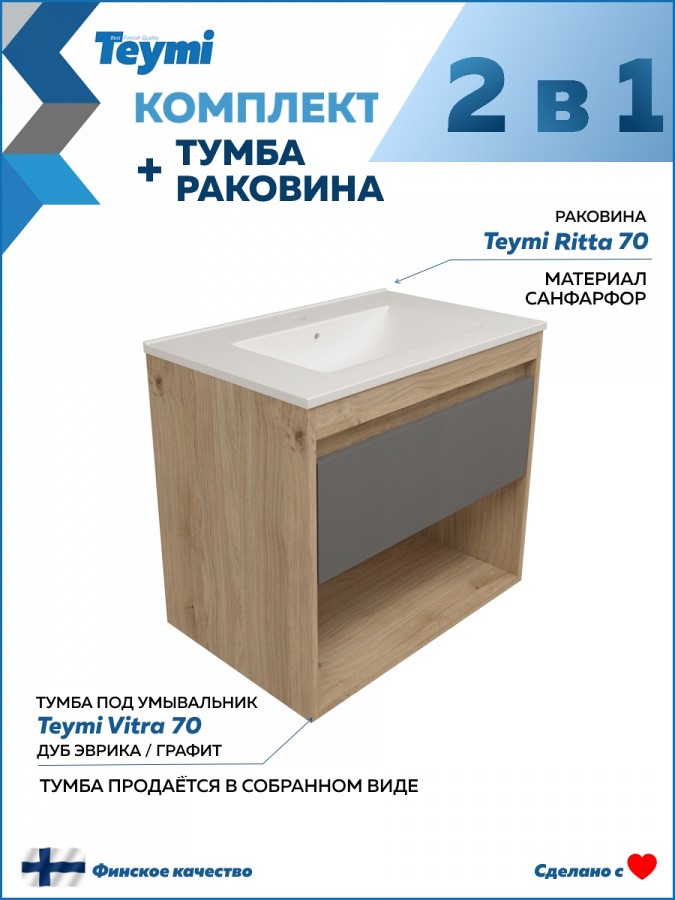 Форма поставки — в собранном виде, что упрощает монтаж и позволяет быстрее наслаждаться обновлённым интерьером. Финский бренд Teymi гарантирует высокое качество: 2 года на мебельную часть и 10 лет на раковину.