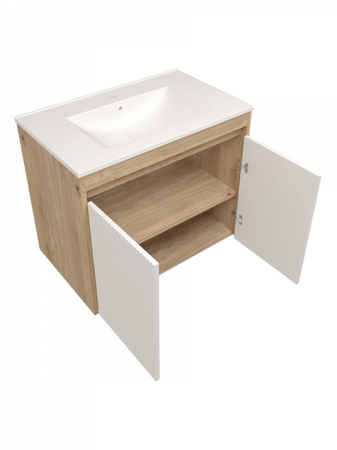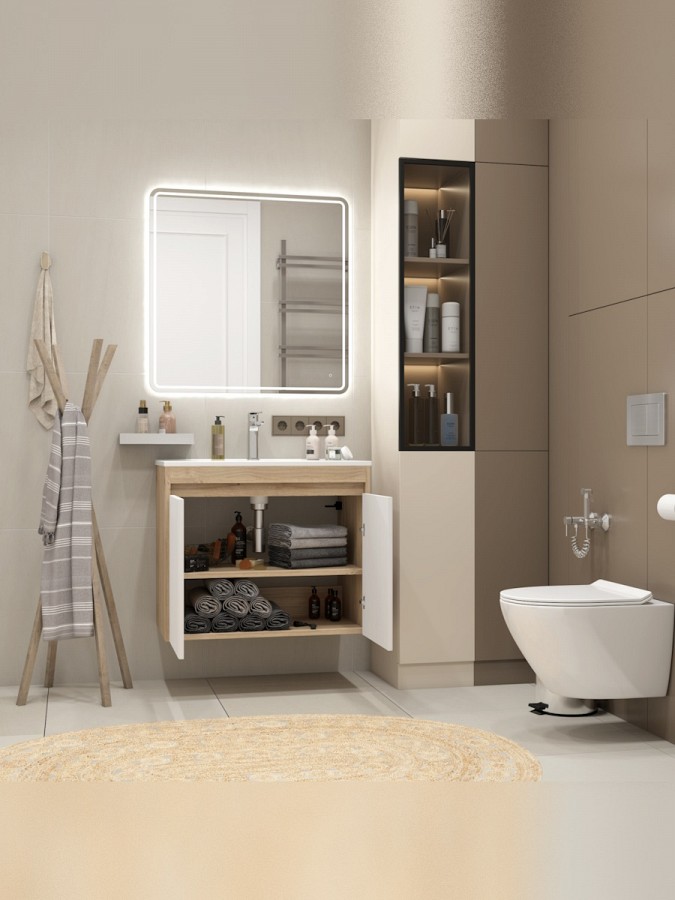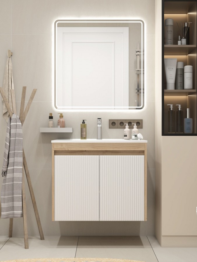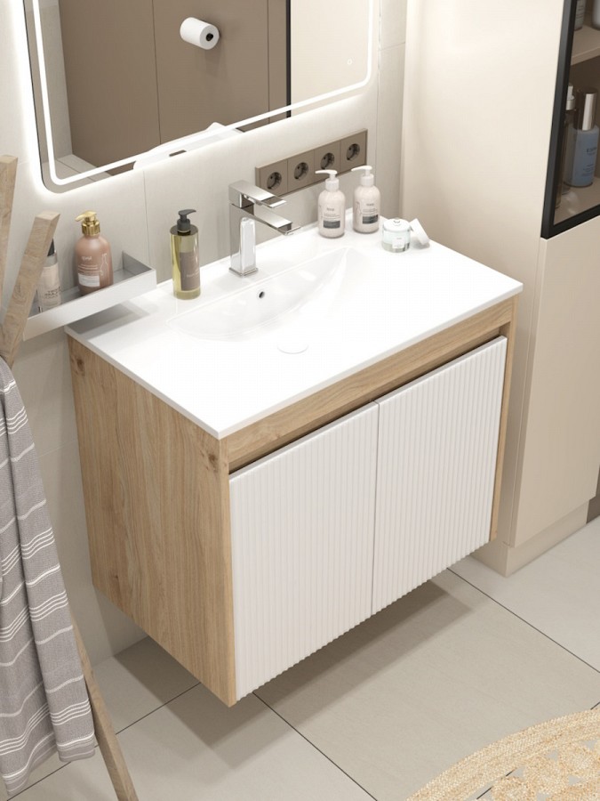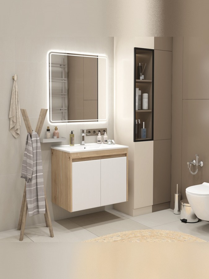 Корпус модели выполнен из прочного ЛДСП цвета светлый дуб, придающего интерьеру тёплый природный акцент. Рельефный волнистый фасад из МДФ с матовым ПВХ-покрытием в белом оттенке создаёт современный, лаконичный вид, подчёркивая чистоту линий и универсальность оформления. Высокое качество материалов гарантирует стойкость к влаге и износу, что особенно важно для использования в ванной комнате.