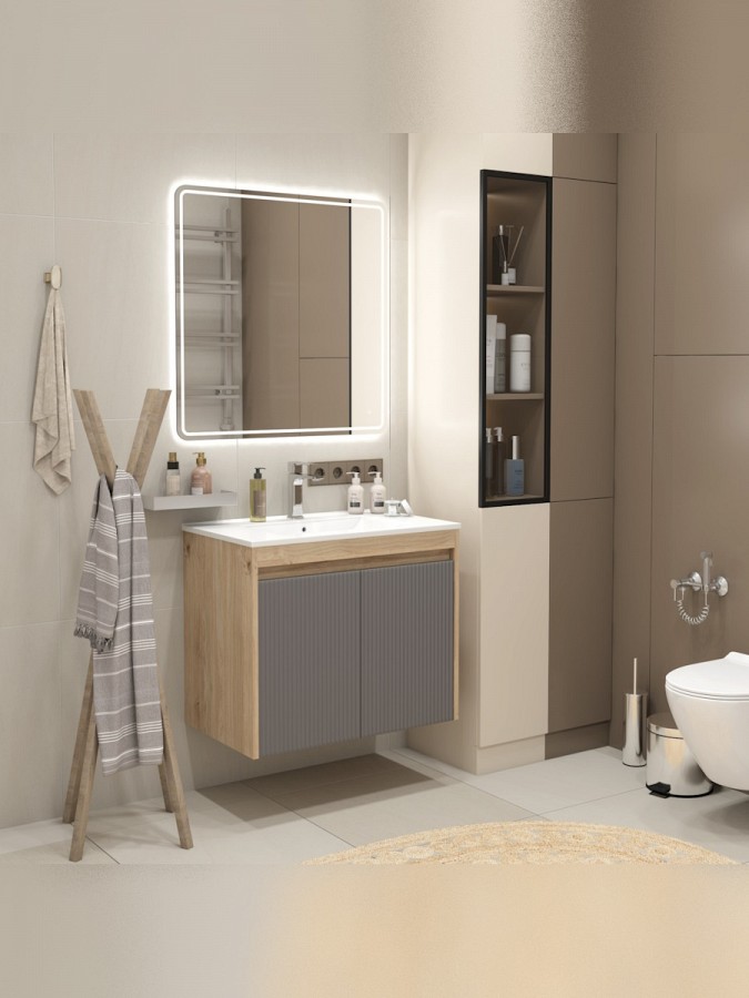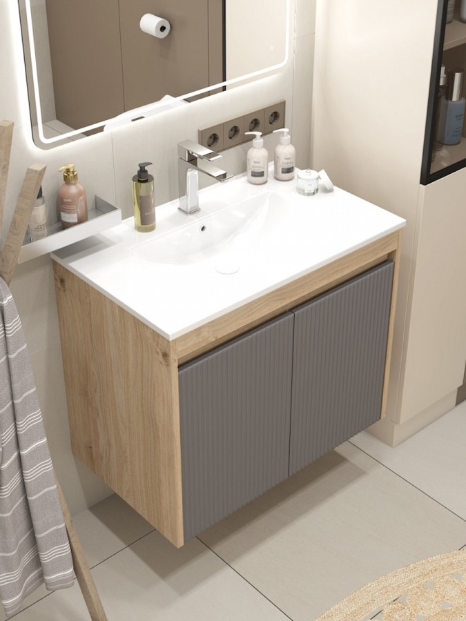 Корпус изделия изготовлен из прочного ЛДСП с текстурой светлого дуба, который добавляет интерьеру уютный природный акцент. Рельефный волнистый фасад выполнен из МДФ в модном графитовом оттенке с матовым ПВХ-покрытием, устойчивым к влаге и механическим повреждениям. Такой дизайн позволяет гармонично сочетать модель с различными отделочными материалами и стилями оформления.