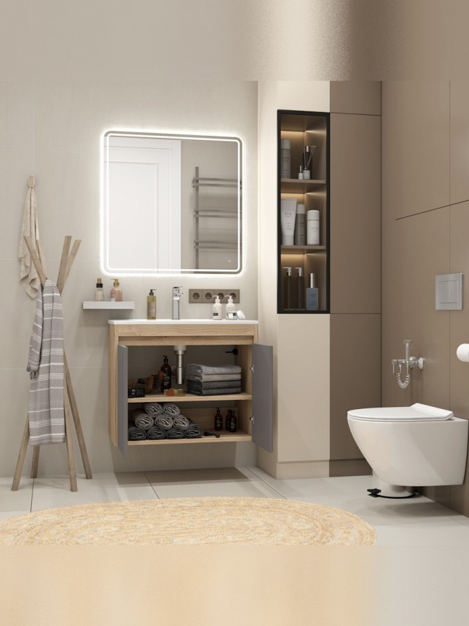 Внутри предусмотрена удобная полка с дверцами на петлях Boyard с доводчиком, обеспечивающим плавное и тихое закрывание. Вместительное отделение позволяет хранить всё необходимое — от бытовой химии до аксессуаров — и помогает поддерживать порядок даже в небольшой ванной комнате.