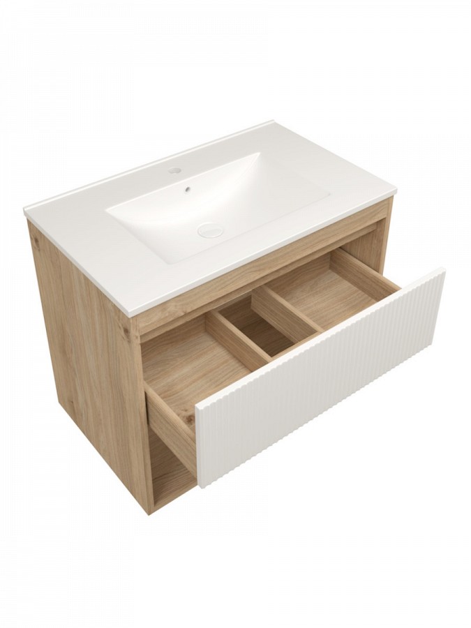 Тумба подвесная с раковиной для ванной 75 см Teymi Vitra корпус дуб фасад белый раковина Ritta 75 F16013 – идеальное сочетание комфорта, функциональности и изысканного дизайна.