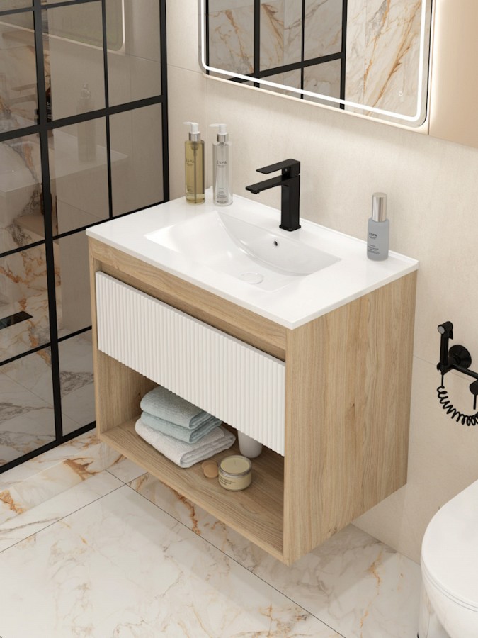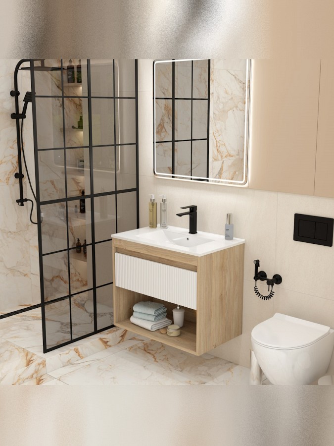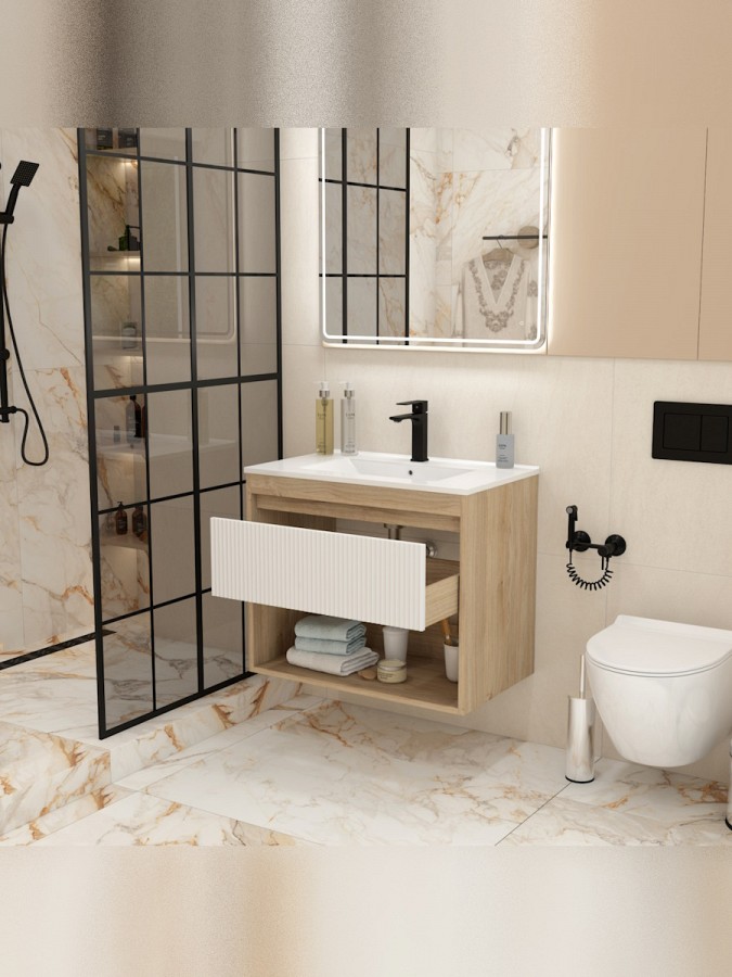 Эта мебель создана для стильного оформления ванной комнаты с вниманием к деталям. Корпус из высококачественного ЛДСП в приятном дубовом оттенке гармонично сочетается с матовым белым фасадом из МДФ, защищённым влагостойкой ПВХ-плёнкой и волнистым рельефом. Такое цветовое решение придаёт интерьеру свежесть, визуально расширяя пространство.