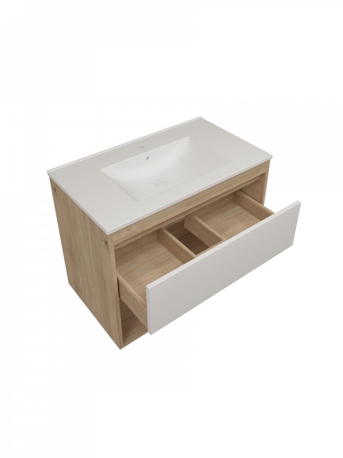 Корпус выполнен из влагостойкого ЛДСП с текстурой светлого дуба, придающего интерьеру естественное тепло и уют. Белый матовый фасад из МДФ с ПВХ-плёнкой подчёркивает элегантность и легко сочетается с любой цветовой гаммой. Такая отделка устойчива к влаге и проста в уходе.