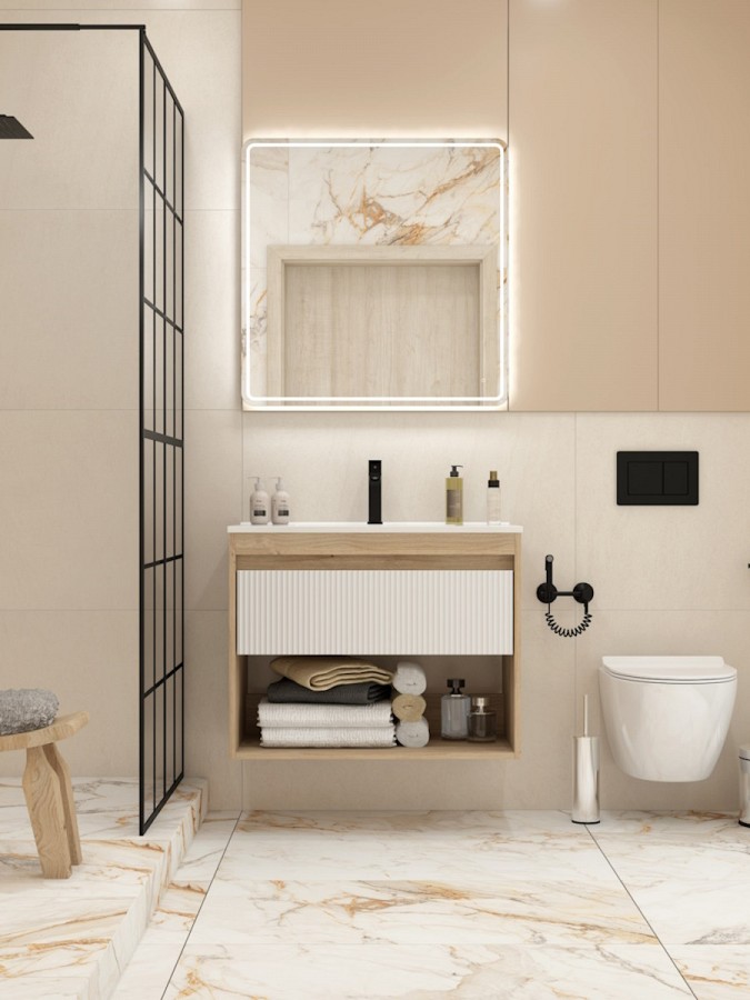 Система хранения продумана для максимального удобства: тумба оснащена одним вместительным выдвижным ящиком на скрытых направляющих Hettich с доводчиком для плавного и тихого закрывания. Внутри есть полка для аккуратной организации вещей — чистящих средств, полотенец и аксессуаров.