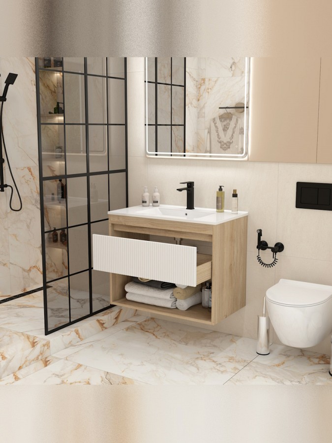 Ширина 80 см делает комплект удобным выбором для просторных ванных комнат. Универсальная ориентация и минималистичный дизайн стиля лофт позволяют органично вписать мебель в разные интерьеры. Подвесная конструкция облегчает уборку, визуально расширяет пространство и создаёт ощущение лёгкости.