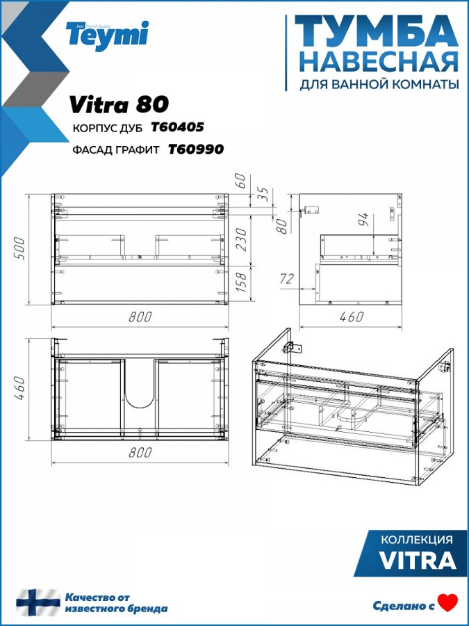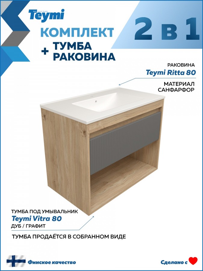 Тумба подвесная с раковиной для ванной 80 см Teymi Vitra корпус дуб фасад графит раковина Ritta 80 F16016 — функциональное и стильное решение для современного интерьера. Модель разработана с учётом удобства, эргономики и долговечности, отлично подходит для семейного использования.