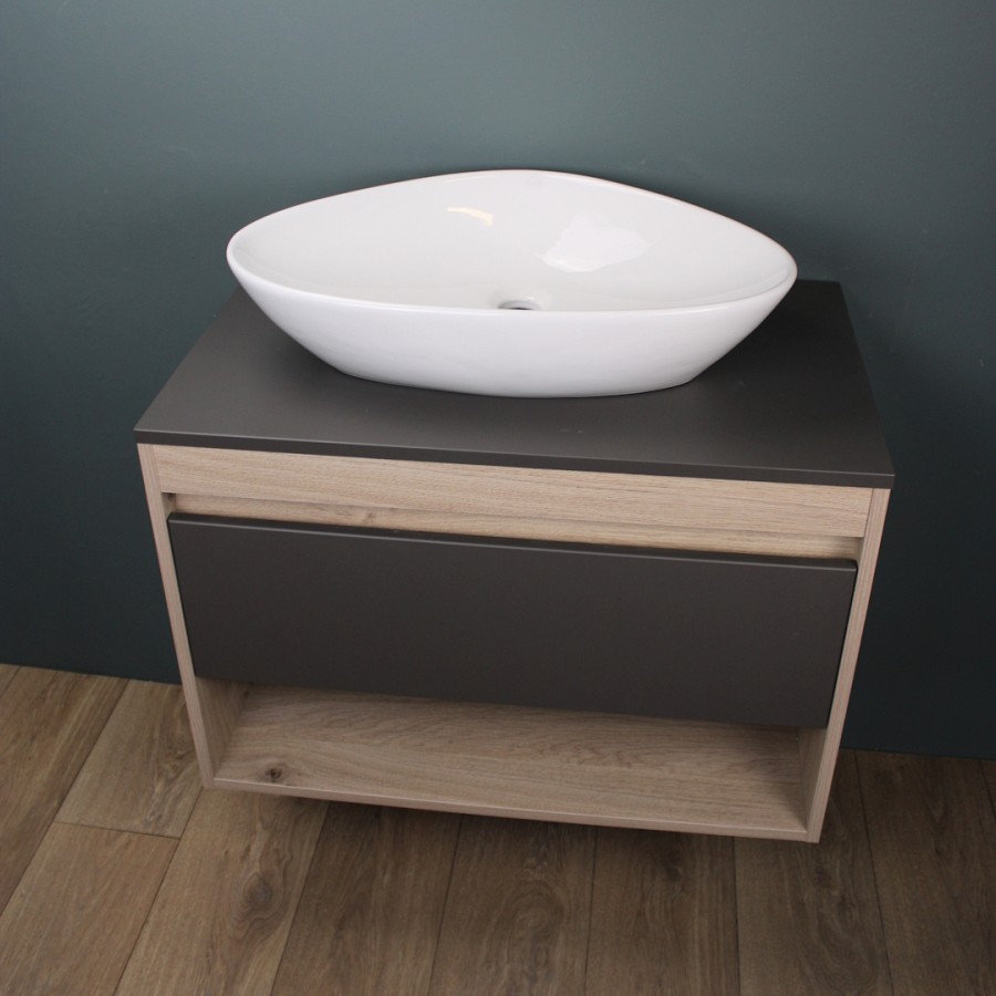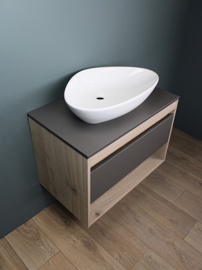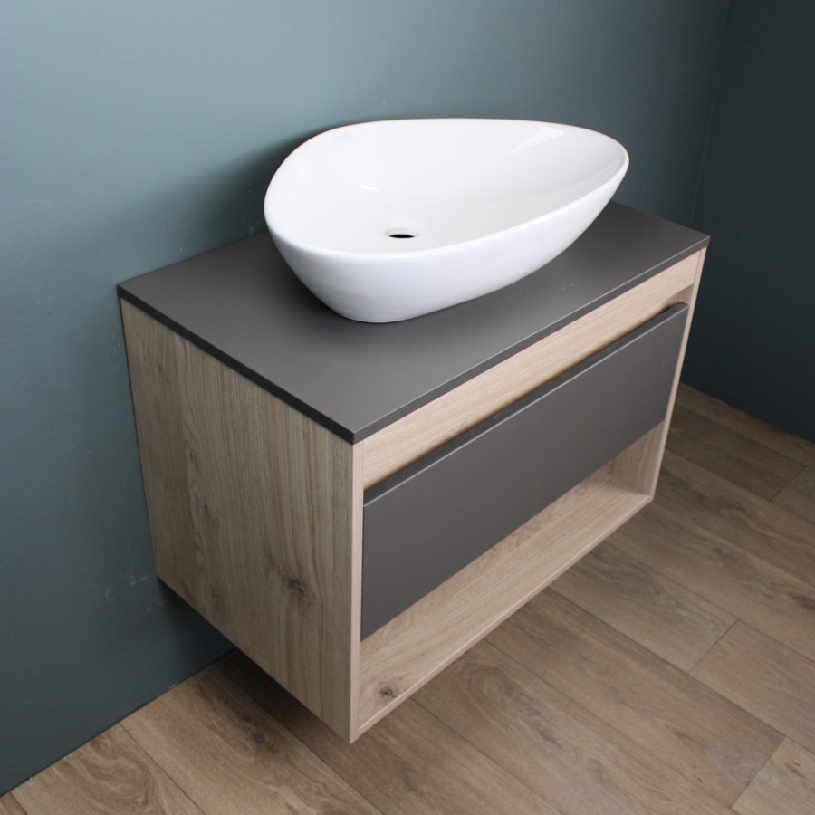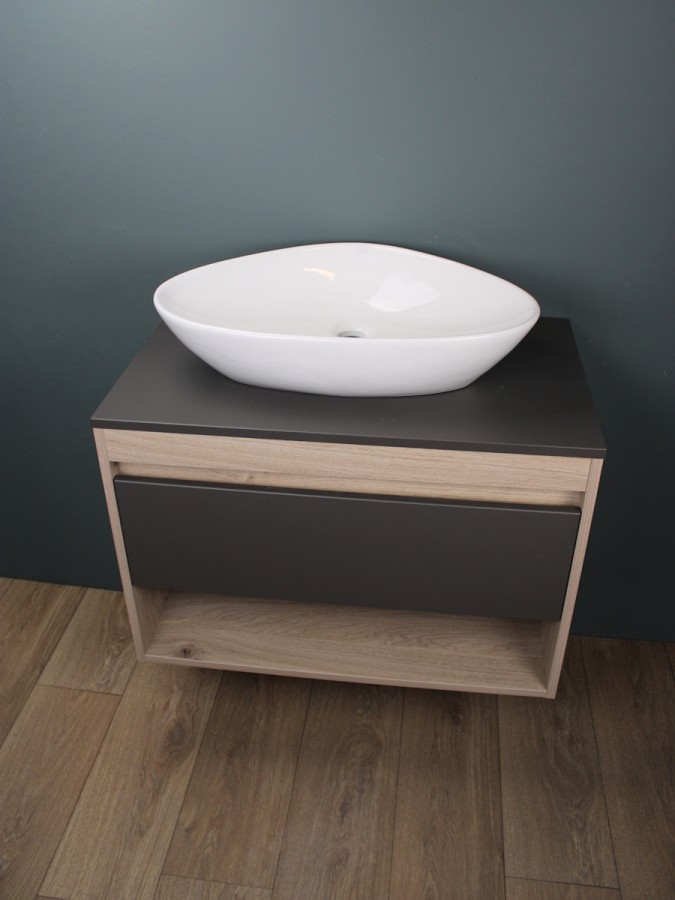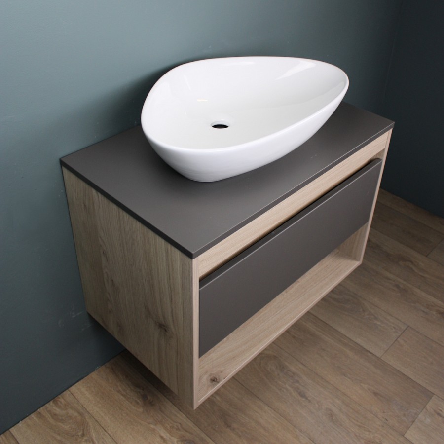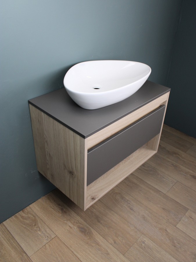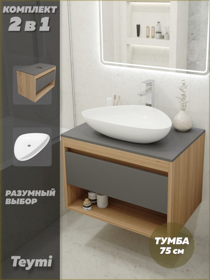 1. Тумба подвесная Teymi Ritta 75, ящик с доводчиком, цвет дуб эврика/графит матовый.