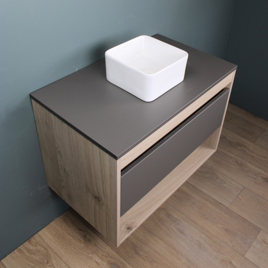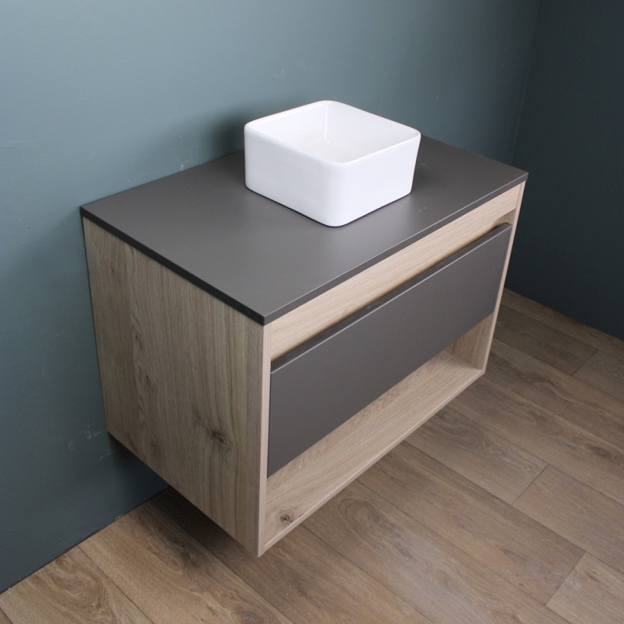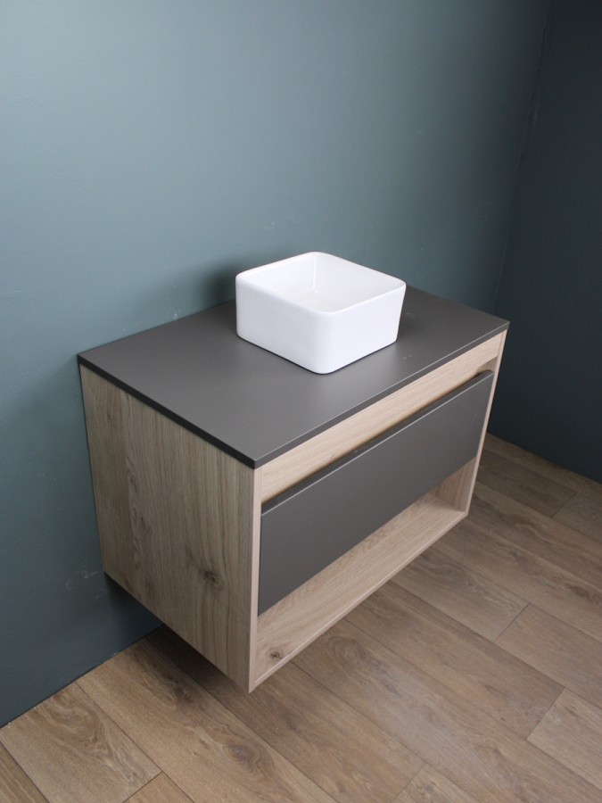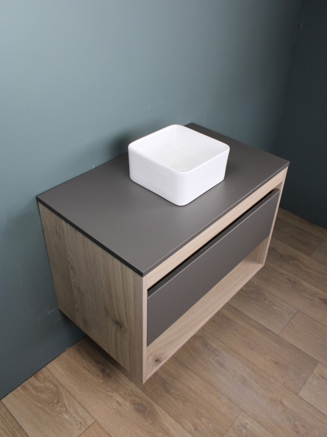 1. Тумба подвесная Teymi Ritta 75, ящик с доводчиком, цвет дуб эврика/графит матовый.