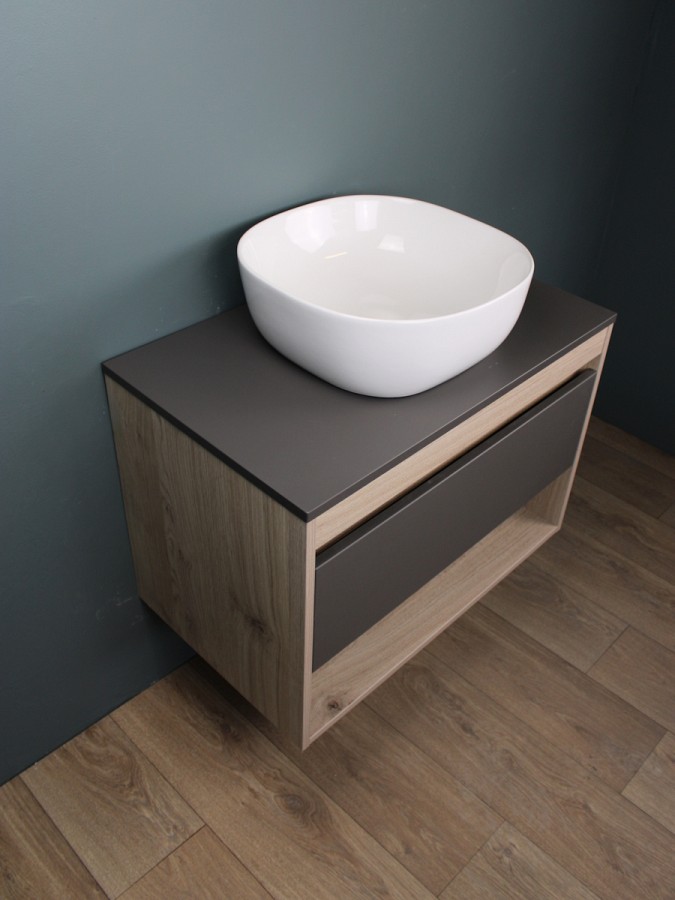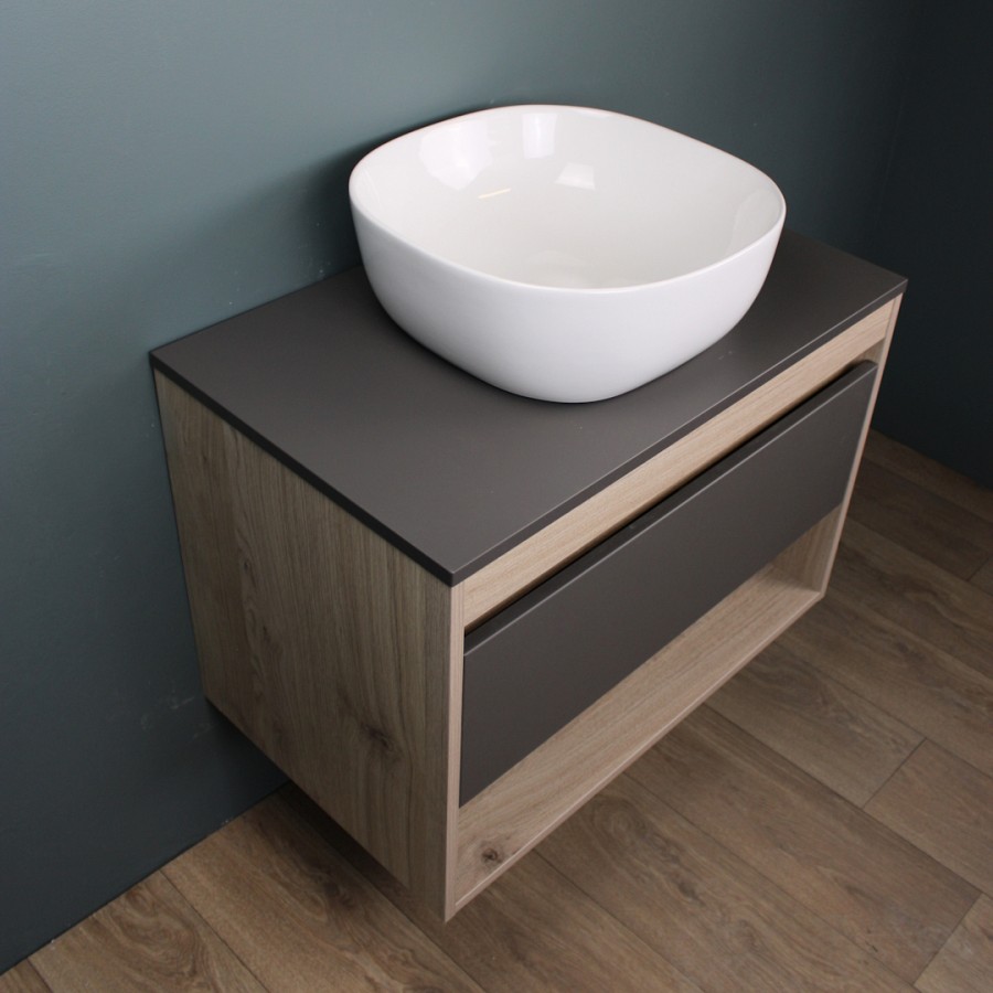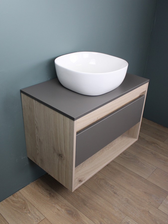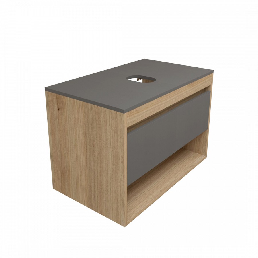 1. Тумба подвесная Teymi Ritta 75, ящик с доводчиком, цвет дуб эврика/графит матовый.