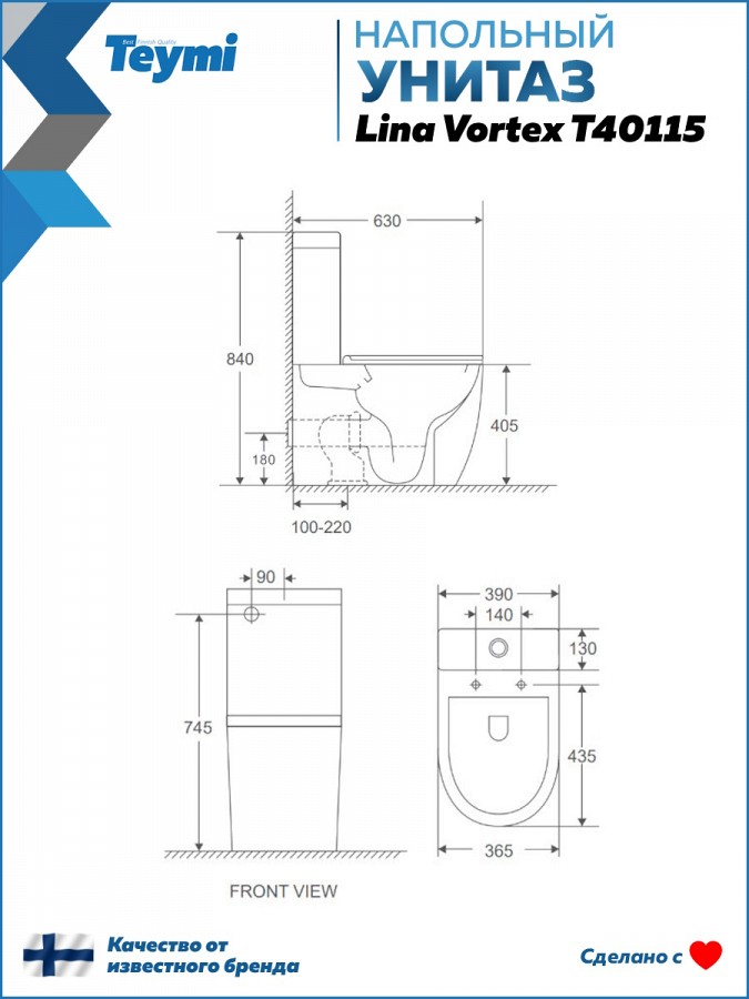 Продукт поставляется с бачком, крышкой бачка, сиденьем, кнопкой смыва, монтажным комплектом, инструкцией и гарантийным талоном. Teymi (Финляндия) предоставляет 10-летнюю гарантию, подтверждая надёжность и долговечность изделия. Lina Vortex — это практичное и стильное решение для современных ванных комнат.