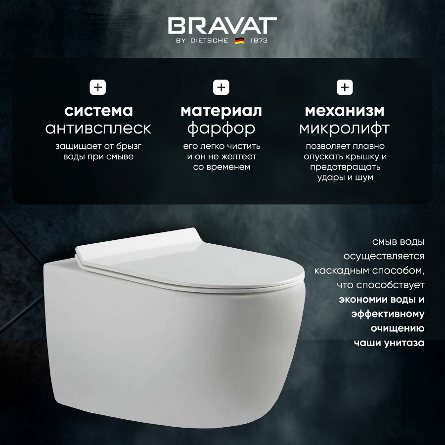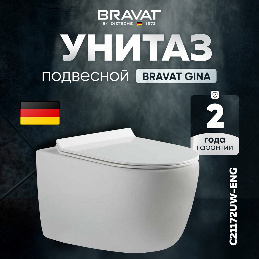<div>Преимущества:<br> <ul> <li>Стильный дизайн в белом цвете;</li> <li> Высококачественный материал из фарфора;</li> <li> Сиденье с микролифтом для плавного закрывания;</li> <li> Система антивсплеск для комфортного использования;</li> <li> Каскадный смыв воды для экономии ресурсов;</li> <li> Гарантия производителя 2 года.</li> </ul> Унитаз подвесной Bravat Gina C21172UW-ENG - это элегантное и функциональное решение для вашей ванной комнаты. Унитаз изготовлен из прочного и гигиеничного материала - фарфора, его легко чистить и он не желтеет со временем. Унитаз имеет горизонтальный выпуск в стену и подходит для установки на систему инсталляции. Сиденье унитаза оснащено механизмом микролифта, который позволяет плавно опускать крышку и предотвращать удары и шум. Унитаз также имеет систему антивсплеск, которая защищает от брызг воды при смыве. Смыв воды осуществляется каскадным способом, что способствует экономии воды и эффективному очищению чаши унитаза. Унитаз подвесной Bravat Gina C21172UW-ENG  имеет классический овальный дизайн и белый цвет, который гармонично впишется в любой интерьер ванной комнаты. Унитаз имеет гарантию производителя 2 года и сертификаты качества.</div>