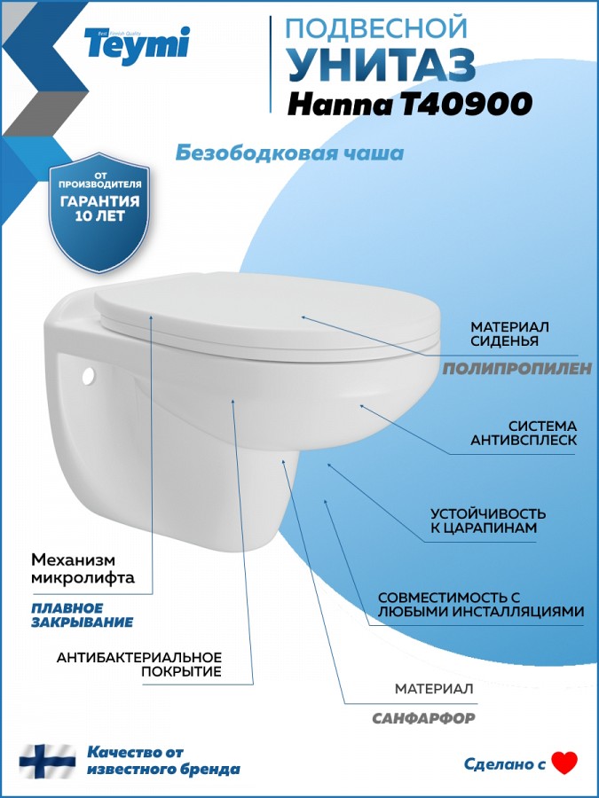 Teymi Hanna T40900 разработан финским брендом с акцентом на качество и эргономику. Производство осуществляется на современных заводах с соблюдением международных стандартов. Модель подходит для бытового применения и поставляется с официальной гарантией 10 лет.