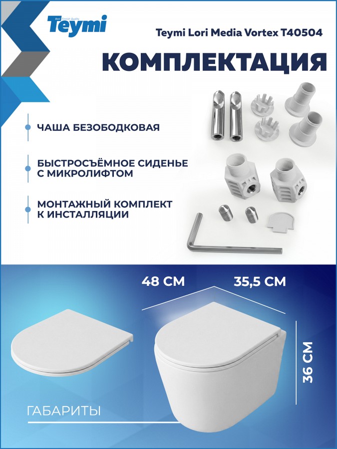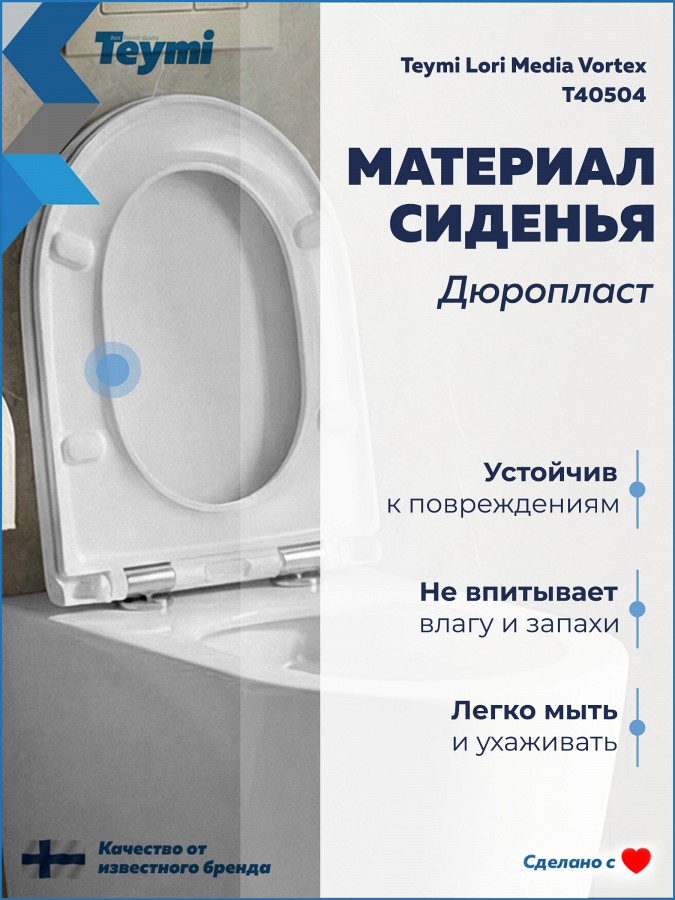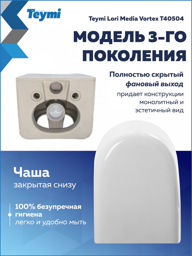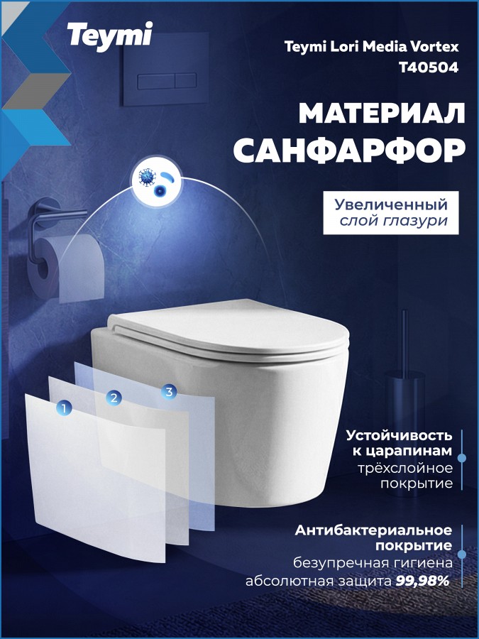 Создайте современный и гигиеничный интерьер ванной комнаты с подвесным унитазом Teymi из коллекции Lori. Модель Media Vortex объединяет в себе эстетику минимализма и передовые инженерные решения для ежедневного комфорта.