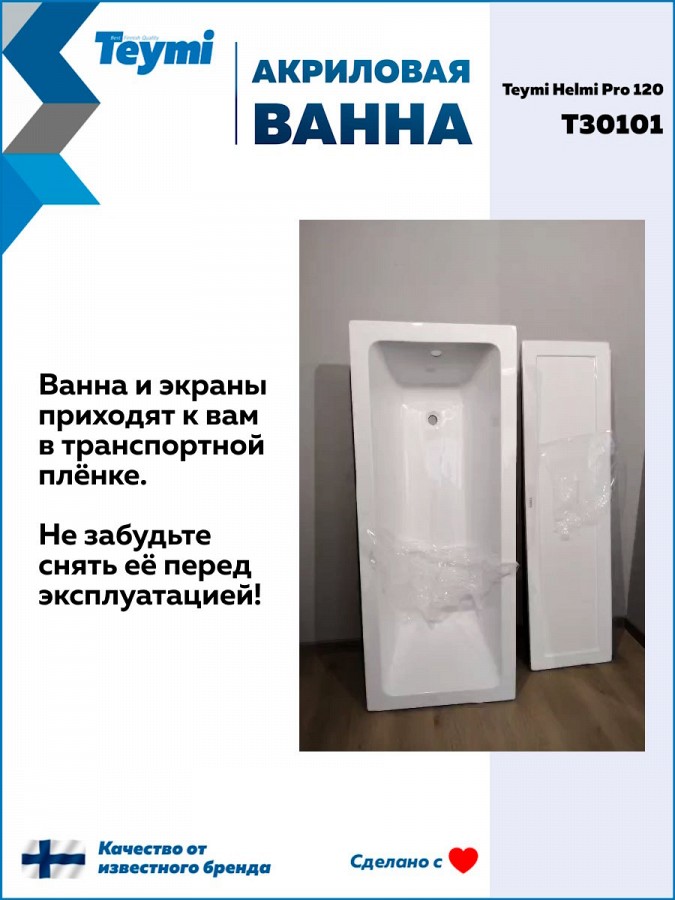 Выбирая ванну Teymi Helmi Pro 120x70, вы получаете сочетание изысканного стиля и передовых технологий. Купить акриловую ванну этой модели можно для установки в квартирах, домах и отелях. Оцените финское качество и безупречный стиль вместе с коллекцией Helmi.